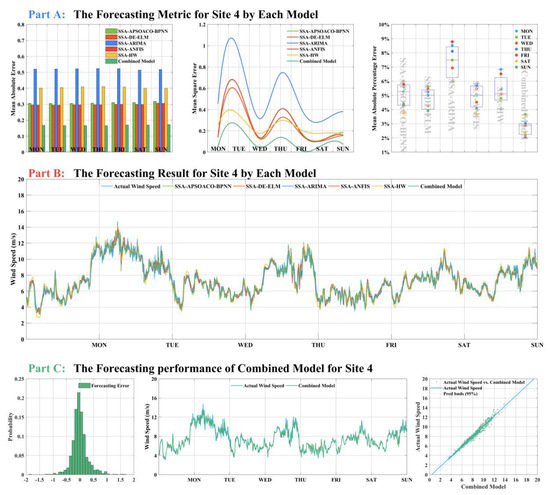 Table 7 that the performance of wind speed forecasting improved by our proposed combined model with SDCS. The wind speed forecasting performance in a week at Sites 1–4 was applied as experimental data. It is obvious that the forecasting performance of our proposed combined model is more accurate than the other single hybrid model for each site. This result responds to the reliability and stability of our proposed combined model taking into account the random nature of the wind and its spatiotemporal variation. For Sites 1–4, the SSA-DE-ELMNN is always superior to any other single hybrid forecasting model. For example, the SSA-DE-ELMNN approach overmatched the other single hybrid models in a week forecasting with a lower MAPE (4.48%) than SSA-APSOACO-BPNN, SSA-ARIMA, SSA-ANFIS, and SSA-HW models with value 4.84%, 7.96%, 6.12%, and 5.30% in Monday from site 3. In addition, our proposed combined model improves the MAPE with the value 0.11% at least (Thursday in site 2) and it also has higher accuracy and stability in wind speed forecasting.