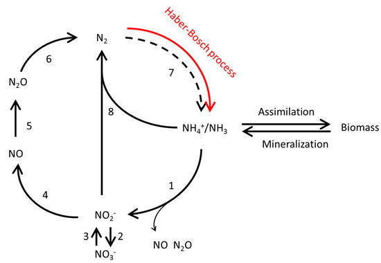 Nitrogen is abundantly present in the atmosphere (almost 80%) in a highly stable and non-reactive form, N2 gas. Nitrogen in its reactive forms (ammonium, nitrite, and nitrate) is essential for plant growth, and its content is limited in soils. Most naturally occurring reactive nitrogen comes from lightning (2%) and biological fixation (98%) [4]. Since the Haber–Bosch process was invented in 1909, which provides an industrial fixation of N2 into ammonia, the production of N-based fertilizers supported the largest historical increase in food production capacity [12]. The Haber–Bosch process more than quadrupled the productivity of agricultural crops [13].