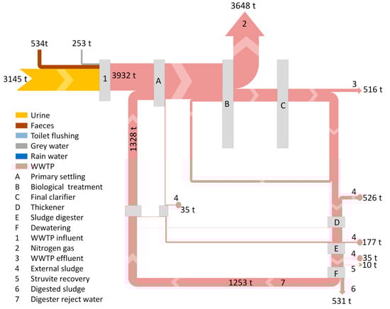 Based on these balances, the concentrations in specific flows can be calculated and related to the total nitrogen inflow through the system (3932 ton N in the influent, 773 ton N from external sludge, comprising in total 4705 ton N). Table 2 shows the results. Urine has the highest contribution and the highest concentration. Based on the urine volume and the assumed mass contribution to the influent (80%), the concentration is 8800 mg N/L, which is close to the concentration of 8830 mg N/L mentioned in Stowa [32]. The second flow with a high concentration is the digester rejects water. At a concentration of 1030 mg N/L, this flow contributes 27% to the total nitrogen inflow.