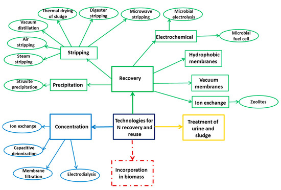At present, many technologies are available to recover nitrogen from wastewater [4,36,37,38]. In principle, these technologies can be divided in four strategies to recover and reuse nitrogen: