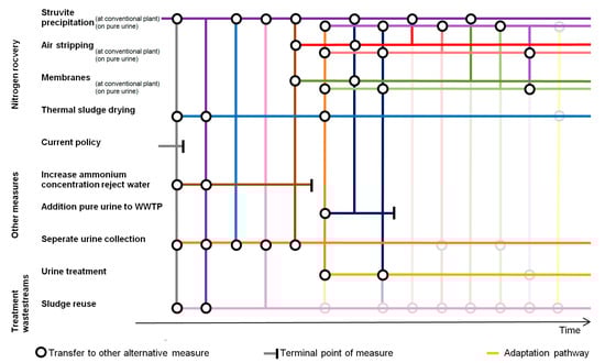 To construct the adaptation pathways, the alternatives were grouped into three specific actions: (1) the recovery of nitrogen; (2) the treatment of specific waste streams; and (3) other alternatives that may affect nitrogen recovery.