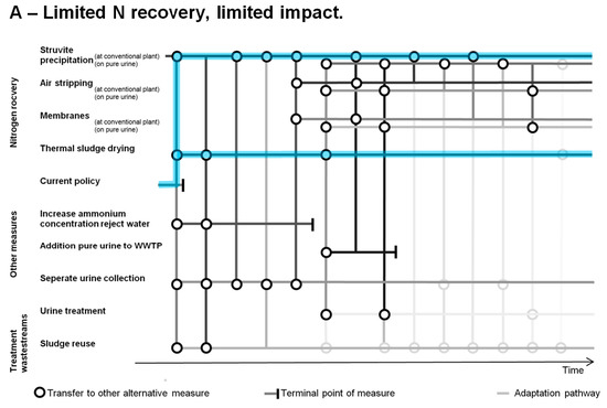 Adaptation pathways for nitrogen recovery from wastewater for scenario A: limited N-recovery with limited impact.
