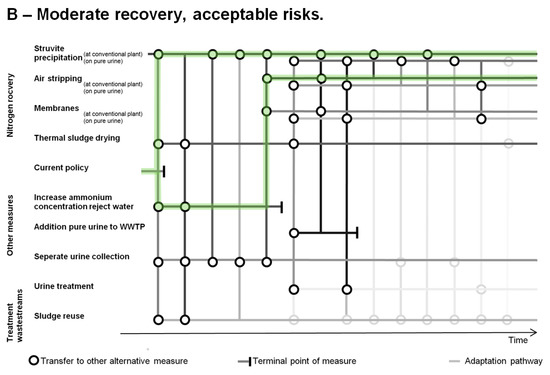 Adaptation pathways for nitrogen recovery from wastewater for scenario B: moderate N-recovery with acceptable risks.