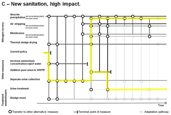 Adaptation pathways for nitrogen recovery from wastewater for scenario C: new sanitation with high impact.