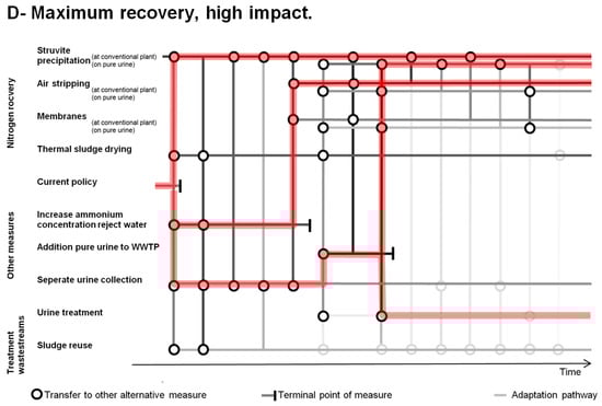 Adaptation pathways for nitrogen recovery from wastewater for scenario D: maximum N-recovery with high impact.