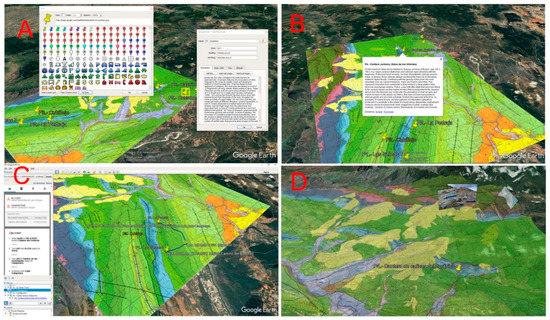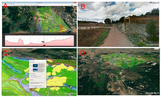 Once identified, catalogued and valued, the six geosites that constitute the itinerary stops are georeferenced in the free Google Earth application in “kml” format. The application allows us to change the icon and assign different colours depending on the type of heritage interest, for example, if we want to combine a geological route with a gastronomic one (Figure 3A). Next, the geological map on the 3D virtual globe is superimposed to relate the lithology of each place of interest. To facilitate the augmented reality, representative images, information sheets with their description and specific cartography, for example, the geomorphological geosite and schemes and interpretations of the geosites observable in the real terrain are geolocated at each stop, while the mobile application analyses their interpretation (Figure 3B,D). In this way, augmented reality enables a better understanding and vision of the contents on the itinerary that will guide us through the different geosites in digital flight. This spatial journey along the geography and on the orthophoto that our mobile device loads thanks to the use of integrated GPS allows the participant to interact with the geological, natural and even cultural heritage that is presented on the route, since this itinerary allows you to load more Google Earth’s own layers, such as interest places, roads, urban areas, all over the orthophoto projected on the 3D globe. The route is decided by the participant, who chooses and analyses the geosite’s subscription by clicking on the “Kml,” the text appears on the virtual balloon and under the description you can click “From here” and then choose the geosite where you want to go by clicking on “To here” (Figure 3B). With this, the mobile device calculates and draws the route based on Google Earth’s geodatabase, tracing the shortest route over the orthophoto or over the thematic cartography that has been superimposed. To these cartographies you can apply a grade of transparency that allows you to observe the orthophoto (Figure 3C,D).