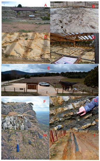 (A) cover under which are the tracks of the dinosaurs. (B) Detail of the size of dinosaur footprints in geosite 1. (C) Dinosaur footprint marks in geosite 2, with an informative panel (D) and idealized prototype at real size (E). (F) Outcrop of limestones with dissolution process and karren generation. (G) Outcrop in which fragments of pectinids and sea urchins are observed. (H) Sauro footprints with relief on the surface of the rock stratum. (I) Remains of the petrified fossil tree.