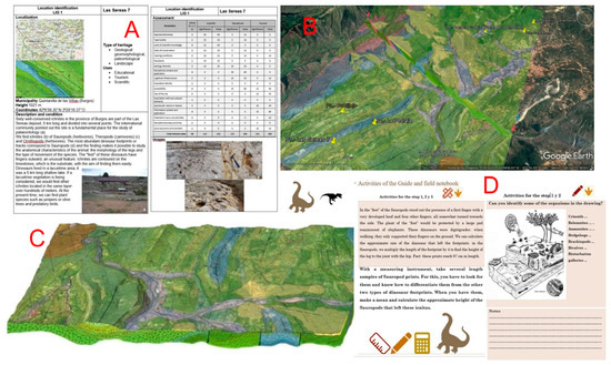(A) Descriptive sheets for each of the geosites analysed. (B) Geological cartography with transparency on orthophoto incorporating a geo-referenced geological cut. (C) 3D diagram block in which the in-depth arrangement of the geological materials is observed where the fossil footprints of the itinerary are located. (D) Field guide for participants “pdf” with activities and questionnaires on singular aspects of the geosites.