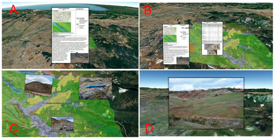 (A) Capture of the descriptive sheet and interpretative schemes of geosite 2. (B,C) Georeferenced photographs on the 3D geological mapping on the virtual globe. (D) Detail of the interaction of a photograph on the Google Earth application.