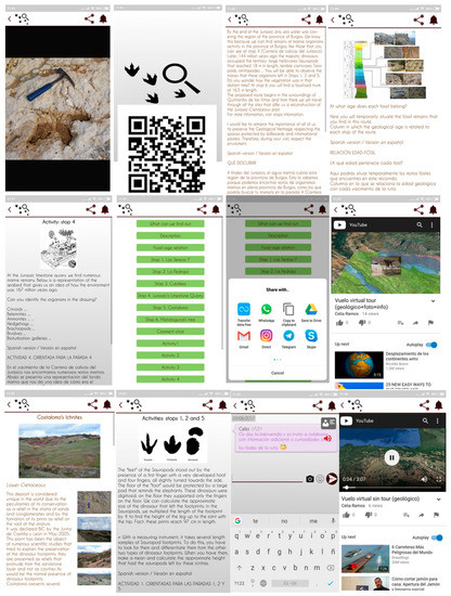 In addition, to facilitate the use of these materials and enhance the geological heritage of the area, a geoapp has been designed for the Android system, downloadable on any mobile device with the “Play Store” application, which displays information organized by geosites and enables the user to execute didactic activities and consult or share information in a comments section. To facilitate the download, a QR code has been included. This geoapp presents a menu (Figure 8) with a series of sections that inform about the route in general, how to carry it out in the proposed order, a temporary outline of the stops, the six stops explained with images that can be enlarged and a “chat” to leave comments for other future users. This section of comments would be used to share images or additional information from visitors, as well as warn of possible deterioration in the conservation of heritage. This chat will encourage users to inform local authorities of issues so that the appropriate measures are taken. Activities in the application are grouped according to their subject. In addition, the application offers the option to share it with your contacts through any application that is installed on the device. The Geoapp is available in Spanish and English, with the purpose of being used by bilingual tourists and any non-Spanish-speaking public. The configuration of the general language of the application depends on the personal configuration of the device, being able to be configured in any desired language.