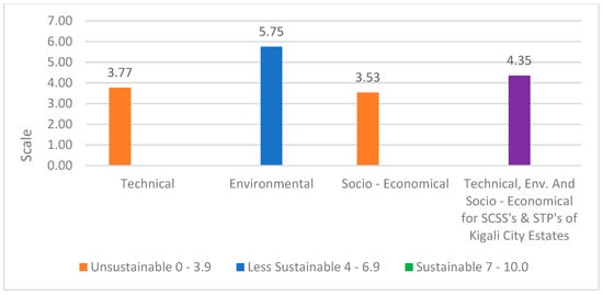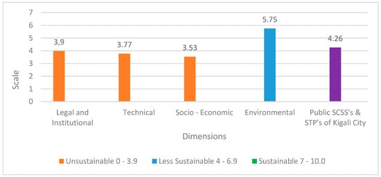 The overall assessment combined the scoring weight criteria for technical, socioeconomic, environmental, legal and institutional attributes. Figure 3 shows the sustainability level of the SCSSs of Kigali city. The assessment showed that the sustainability level was Less Sustainable in the technical, socioeconomic, legal, and institutional dimensions due to the poor management practices and the absence of legal instruments. The dimensions that were linked with community involvement and institutional framework were the ones that reduced the efficient performance of SCSSs and STPs.