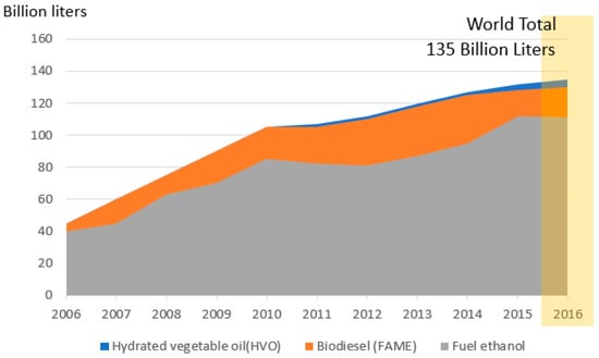 Global trends in ethanol, biodiesel, fatty acid methyl ester (FAME), and HVO production, 2006–2016 [3].