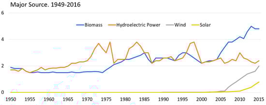 - Renewable energy consumption [Figure 10.1]. In Monthly Energy Review; U.S. Energy Information Administration, Government Printing Office: Washington, DC, USA, 2018. Available online: https://www.eia.gov/totalenergy/data/monthly/pdf/sec10_2.pdf (accessed on 1 October 2018).