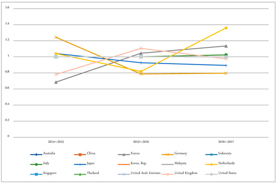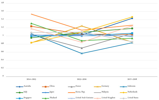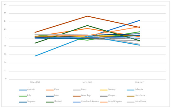 Figure 2 shows the “efficiency change” (catch-up effect) of the 15 DMUs from 2014–2017. It hs been found that DMU3 (France), DMU4 (Germany), DMU11 (Singapore), and DMU14 (United Kingdom) represented a decreasing trend of closeness between the frontier and a decision-making unit. France needs to catch-up to its efficiency values by 5% on average, while Germany need 6%, Japan 4%, Singapore and Malaysia 1%, and the United Kingdom 5%. On the other hand, Australia, China, Indonesia, Korea, Thailand, the USA, and UAE are efficient enough and do not need to catch-up. However, the trend of the catch-up values implies that most of the DMU’s had started improving their efficiency.