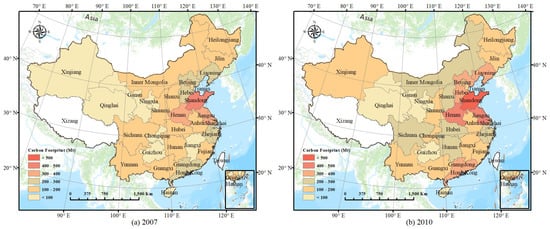 Distribution of carbon footprints in (a) 2007 and (b) 2010 for each provincial unit of China (Note: Mt = 106 tons). Tibet, Taiwan, Hong Kong, and Macao contained no data.
