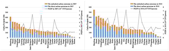 Figure 3 shows the direct carbon emissions and embodied carbon emissions in the provinces of China for the years 2007 and 2010. Nine economically developed provinces, namely Beijing, Tianjin, Guangdong, Shanghai, Shaanxi, Guangxi, Zhejiang, Anhui, and Jilin, had more embodied carbon emissions transferred from other regions than direct carbon emissions, which implies a potential shift of emission reduction pressure to other provinces. Shanghai, Beijing, and Tianjin, which feature high per capita GDP and large consumption needs, had the largest shares of embodied carbon emissions (approximately 70%) of their provincial total. The other 21 provinces had greater direct carbon emissions than inter-provincial embodied carbon emissions. In other words, they were able to meet most of their own consumption demand through local production.