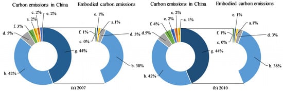 The proportions of direct and indirect carbon emissions in 2007 (a) and 2010 (b): a. the agriculture, forestry, animal husbandry, and fisheries sector; b. the industry sector; c. the construction sector; d. the transportation and warehousing sector; e. the wholesale and retail trade sector; f. the other services sector; g. indirect carbon emissions or embodied carbon emissions in inter-provincial trade.