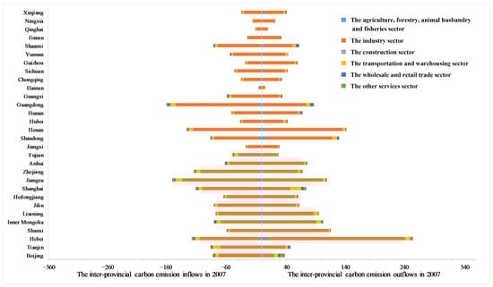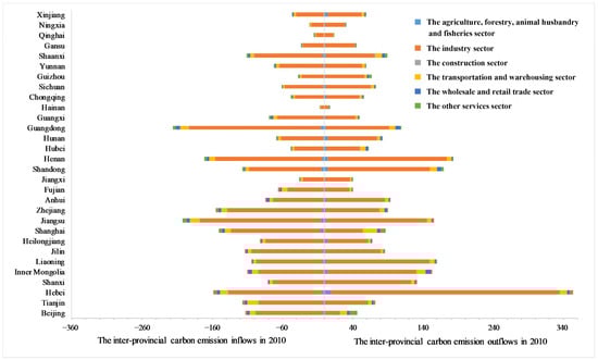 Figure 5 and Figure 6 demonstrate the inter-provincial carbon inflows and outflows of each sector for each province in both 2007 and 2010. The inter-provincial carbon emission inflows were mainly concentrated in the industrially developed provinces, such as Guangdong, Hebei, Henan, Jiangsu, and Zhejiang. The inter-provincial carbon emission inflows were small (less than 30 Mt) in Western China, such as in Qinghai, Ningxia, and Gansu. As one of the four pilot provinces selected by the National Development and Reform Commission to implement carbon emission trade policy [31], Guangdong had an inter-provincial carbon emission inflow of 160.75 Mt in 2007, ranking in first place of all provinces. In 2010, the carbon inflow of Guangdong Province further increased by 34% compared to that in 2007.
