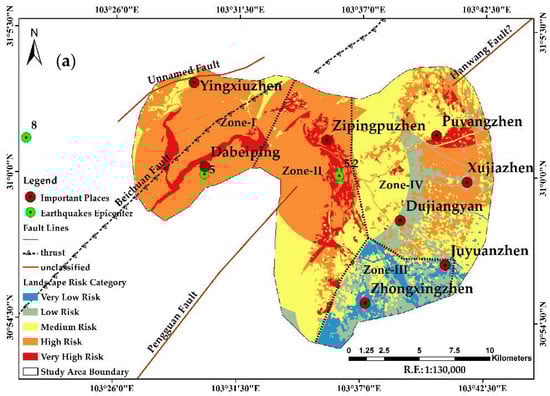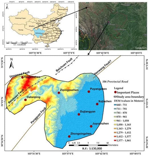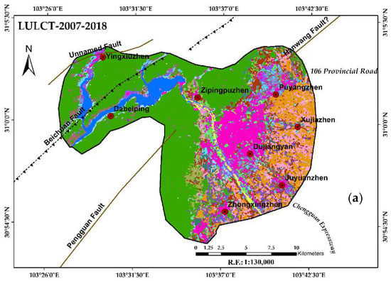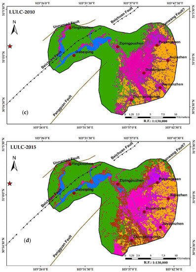 In this paper, we have studied LULC change, LULC transitions (LULCT), and landscape risk (LR) evaluations in Dujiangyan City and Environs (DCEN) located in Sichuan province, SW China. LULC in DCEN has been impacted by the deadly Wenchuan earthquake of 12 May 2008, which caused major landscape changes over the past decade. A comparison and analysis of LULC prior and after the earthquake is important in understanding the changes in spatio-temporal LULC [,,,,]. After the 2008 Wenchuan earthquake, the Chinese government rebuilt the city during 2008–2010. Some of the surviving people, together with new people from outside, moved in the city.