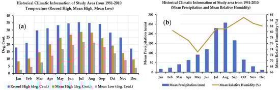 Historical climatic information of the study area from 1981–2010 represents different temperature information: (a) Temperature data (record high, mean high, and mean low); and (b) mean precipitation and mean relative humidity. Source: China Meteorological Data Service Center, and Weather China; http://en.m.wikipedia.org/wiki/Dujiangyan.