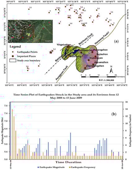Frequency of earthquakes in the study area during 12 May 2008 to 15 June 2009; (a) top right indicates the location of earthquakes points only within white bounding box; left panel shows the location in Google earth, and bottom right panel shows the locations of earthquakes of two different magnitudes, overlaid over the 2008 Landsat 5 TM false color image (bands used: R, G, B: 5,4,3), and represented with red dot circles. The main earthquake event epicenter (8.0 Mw) is located in nearby zone west of the study area; and (b) Time series plot of earthquakes struck in the study area and its environs displayed with earthquake magnitudes vs their frequencies (data extracted and mapping based on list of 2008 Sichuan earthquake main and aftershocks.