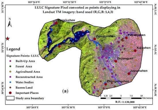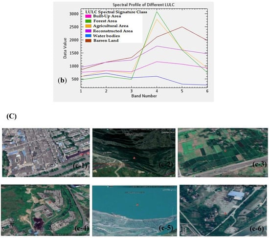 The heterogeneous landscape in the study area consists of a mixture of built-up area, forest area, agricultural area, reconstructed area, water bodies, and barren land, respectively. Spectral signatures of six different features were drawn on a Landsat image in an integrated manner with distinct line colors (Figure 4b). In the image signature and spectral profile, both used the same color code for clear identification, where: Pink = Built-up area (BU), Dark green = Forest area (F), Orange = Agricultural area (AG); Purple = Reconstructed area (RA), and Blue = Water bodies (WB); and Maroon = Barren land (BL), respectively. The spectral profiles of six different classes were further verified and validated with the USGS spectral library that is available in ENVI spectral library tool box with the ENVI 5.3 version software. To identify the unique pattern of each LULC, 20 signatures class are drawn over image for each class identification. A total of 120 signatures were collected that represent six LULC class used for image classification. Table 2 shows LULC classes and descriptions [,,].