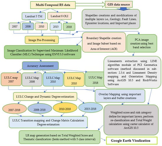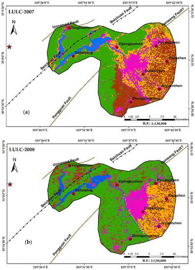 In the present study, multi-temporal Landsat data for the period 2007–2018 are considered for the detailed analysis. The LULC of the year 2007 is considered before the earthquake (BEQ), and compared with LULC after the earthquake (AEQ) (8.0 Mw) in May 2008 for the analysis of LULC changes. We have also considered the 2010 and 2015 LULC for changes with rebuilding, whereas the current year (2018) is considered for studying the present status of LULC, LULCT, and LR of the study area. Based on LULC changes and LULCT maps, a change matrix (CM) was calculated for the period 2007–2018. These LULCT have been mapped in four different time frames, subtracting earlier images from the recent image (e.g., 2007–2018; 2008–2018, 2010–2018, and 2015–2018) for the change evaluation and the detailed analysis. The disaster chain effect is the main properties of landscape risk. Furthermore, along with these, LR areas have been investigated and evaluated with multiple parameters, such as earthquake epicenter locations, local geology, fault lines, geomorphological features, lineament density (LD), and LULC data. For instance, three different time periods (e.g., 2007 as BEQ, 2008 as AEQ, and 2018 as present scenario) were considered for risk evaluation using remote sensing and GIS tools.