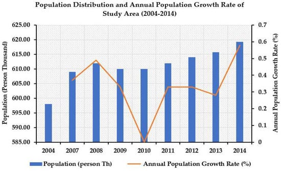 Historical population statistics data suggests that the study area had a lower population in 2004 (598 person thousand), and from 2007 (BEQ) in 2008, the population showed an increasing trend. AEQ, the population loss was huge, and it remained low until 2010. From 2011–2014, the population in this area increased from 609 to 619 person per thousand, and the annual population growth rate increased at the rate of 0.6% (Figure 6).