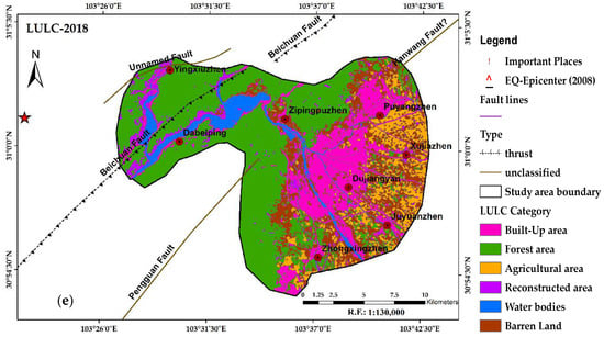 From the western, southern, and northeast parts of the mountain to the north part of the study area, F region showed an increase from an area of 124.04 km2 in 2007, to 175.45 km2 in 2008 (Figure 7a,b), due to massive plantation activities after the earthquake, to maintain the ecological balance of the area. The areas declined to 148.63 km2 in 2010 (Figure 7c) to 130.45 km2 in 2015 (Figure 7d). The F region gradually declined due to reconstruction phase work, whereas the current scenario suggests an increasing state, at 139.25 km2 in 2018 (Table S2). In contrast, BU area expansion continued until January 2018 (Figure 7e). One of the major geological fault lines, the Hanwang fault, which crosses the northeast region, and another that crosses in the SW–NE direction, flanking towards the NE (e.g., the Pengguan fault), form the BU region, which is seismically active. One of the aftershocks (Mw 5.2) (black dot small red circle) was located in the near half of these two fault lines, close to the BU area (see Figure 3a).