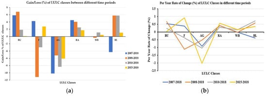 LULC change distribution in four different time periods; (a) Gain/Loss (%) of each LULC classes, (b) Per-year rate of change (%) of LULC classes in different time periods. Note: BU—Built-Up area; F—Forest area; AG—Agricultural area; RA—Reconstructed area; WB—Water bodies; and BL—Barren Land.