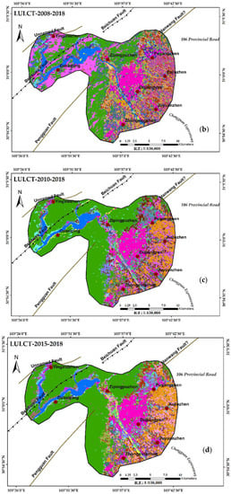It was necessary to make a LULCT mapping based in different time periods to identify the transformation of each LULC through a visual, as well as a quantitative manner. LULCT mapping was performed with change in the workflow module of the ENVI 5.3 software, where each earlier LULC map was overlaid with recent one, in order to produce a transition matrix for each time period. Based on the six LULC categories, LULCT maps of four time periods (FromTo approach) such as 2007–2018, 2008–2018, 2010–2018, and 2015–2018 have been prepared (Figure 9a–d), and corresponding change matrices of each time scales (where each conversion record was presented) were generated, with the change matrix calculation toolbar of the ENVI 5.3 software (Tables S3–S6). The bold values along the transition diagonals of each matrix table indicate the LULC types from time t1 to time t2 (t2 > t1), with the amount of LULC categories (area in km2) that remained unchanged through each time period scale; while the off-diagonal data represent a transition from one LULC class category to another. Based on the LULC change class of each particular time period, the rate of change (km2) per year of each LULC class was calculated in Microsoft Excel.