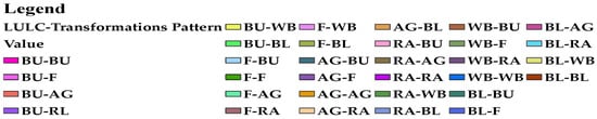 The LULCT took place between F to BU, AG to BU, and AL to BL, in particular. In the northeast, central, and southeast area of DCEN, the F transition, including BU, RA, AG, and BL are prominent, whereas the RL transition included BU, AG, and BL, and the AL transition included BL, F, and BU, respectively. Besides these, other minor transitions were also present in the study area (see Table S3). The LULCT during 2007–2018 is shown in Figure 9a. We observed increased area (204.35 km2), and changing by 18.58 km2 per year from 2007–2018 in BU. Moreover, AL and BL also showed positive changes, which held second (80.57 km2, changed 7.32 km2 per year) and third (29.72 km2, changed 7.32 km2 per year) positions, respectively. Forest area (F) also increased (10.33 km2), with a change of 2.70 km2 per year) during this period, along with both RA and WB, which were also observed to have minor changes. Similarly, based on the change matrices in Tables S3–S6, the rate of change per year was calculated for the corresponding time periods. Figure 9b–d represent the LULCT scenarios in the different time periods 2008–2018, 2010–2018, and 2015–2018, respectively.