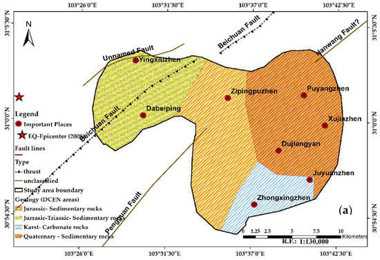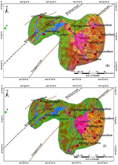In this section, the present study further utilized an integrated approach based on the method discussed in Section 2.3.4, and we evaluated the LR zone. The study area is characterized by various limitations that appear in the form of faults and lineaments. The heterogeneity of the geological structure, and lithological types in the study areas during the Jurassic–Triassic, Jurassic, Karst, and Quaternary periods, respectively are shown in Figure 10a. These complex structures formed due to complex drainage networks that cut their way into the rock surface, and formed steep slopes (Figure 10b). The aspect (degrees) map was derived from DEM (30 m resolution) to visualize the terrain conditions of the study area (Figure 10c) with active fault lines in the Sichuan basin, including the study area [].