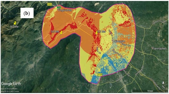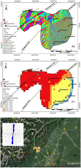 In contrast, the structure of the study area and its surroundings are dominated by the Beichuan fault [], Pengguan fault [], Hanwang fault [,], and an unnamed fault [], respectively. The major strike of these faults is in the NE–SW direction, and the corresponding fault layer is overlaid on the GE for visual representation (see Figure 10d).