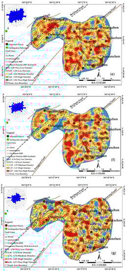 For landscape planning and management in the earthquake prone areas, it is important to identify the LR areas, which must be prioritized for future sustainable development. We have further focused on the DCEN area for LR area mapping. In the past, the DCEN was marked as a tectonically active area. Therefore, the area needs vital attention to assess the present risk pattern at the landscape level. Lineament data extraction was necessary along with combinations of other ancillary data sets. Lineament data were further used for lineament density (LD) maps over the period 2007–2018. The LD maps were prepared based on five classes, from Very low to Very high-density distribution in three time periods, 2007 as BEQ, 2008 as AEQ, and 2018 as the present scenario, respectively (Figure 10e–g). The LD values changed and slightly increased in AEQ, categorized as Very High Density, which was 3.95 km/km2 in 2007 (BEQ), and 4.04 km/km2 in 2008 (AEQ), respectively; the current stress pattern shows almost double the BEQ values (8.27 km/km2: Very High Density) which is reflected in the recent LD map of 2018 (Figure 10g).