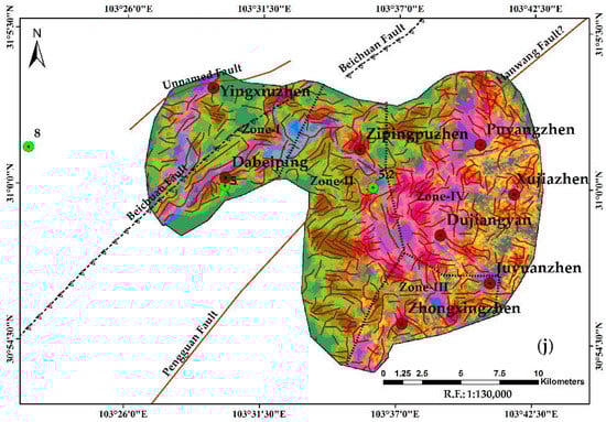 Landscape factors, including the structural distribution and integrated overlay mapping of the study area; (a) Geology map of Dujiangyan City and its Environs (DCEN); (b) Slope map; (c) Aspect map; (d) Fault line distribution and its orientation on Google Earth; (e) Lineament, Lineament Density, and its orientation map—2007; (f) Lineament, Lineament Density, and its orientation map—2008, (g) Lineament, Lineament Density and its orientation map—2018, (h) Integrated layers overlay map—2007; (i) Integrated layers overlay map—2008, (j) Integrated layers overlay map—2018.