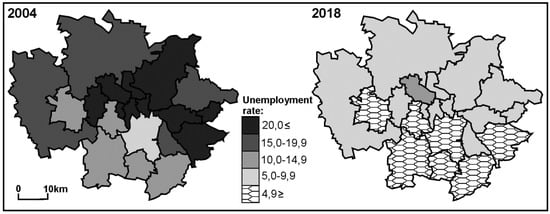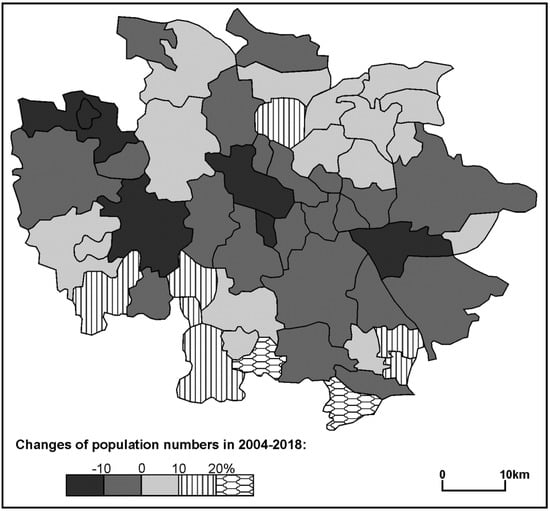 8]. Paradoxically, the progressing depopulation could be treated as a factor enhancing the region’s recovery from the crisis. A decreasing working age population reduced the unemployment rate. However, 2017–2019 is the borderline of a new period in the economic evolution in the region, when the decline in the number of residents will result in a shortage of workforce for the surging number of new jobs. This phenomenon is already occurring, and the average unemployment rate in the region is around 5–6%. New jobs do not attract employees, as depopulation is now more and more determined by social and demographic factors as well as spatial circumstances (negative perception of the urban space of post-industrial cities). They are so strong and enduring that every 5 years some towns with populations of 150–200-thousand lose 10,000 residents. In 1989–2018, most of the large and medium-sized towns in the Katowice conurbation lost about 20% of their population (and 8–12% in 2004–2018), and in the case of townships that were split into several separate settlements that figure may be even up to 40% (