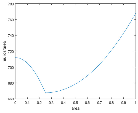 where is a constant that ensures that the average cost of crop i () has a certain value per hectare, which can be consulted in literature (). This function assumes the costs are greater for smaller areas, then decreases until a certain area value, and finally increases again, as shown in Figure 1. The function is a mathematical attempt to describe this behavior for the cost. The constants present in the above formula are such that the costs of the crop as function of its area are a continuous function. Note that data on average cost values as function of the area are not available.