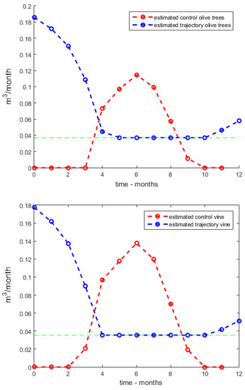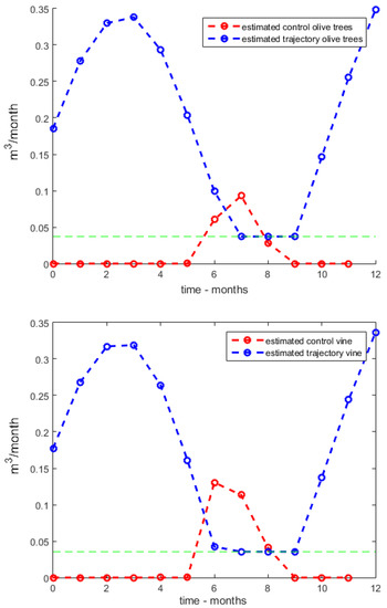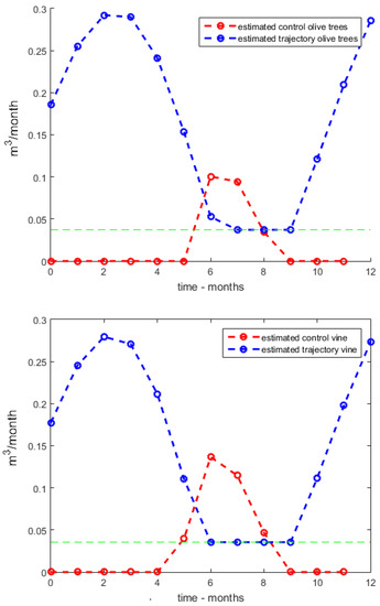 Water in the soil (blue line is the trajectory) and irrigation (red line is the control) per m for Scenario 9: (top) olive trees; and (bottom) vines.