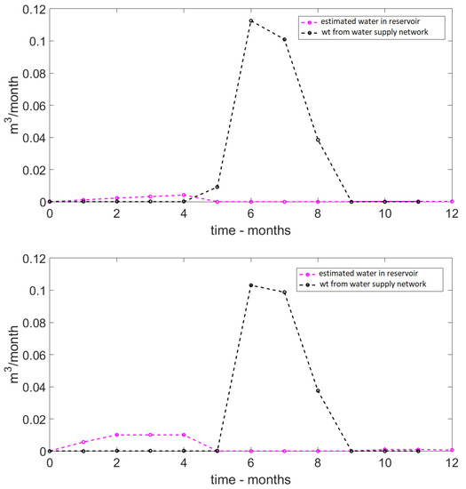 In the case that water from the rainfall is collected, it is important to know how the profit changes. Two scenarios were simulated. In the first one, of water from rainfall is collected and, in the second one, of water from rainfall is collected. In the first case, the profit increased to 235 euro/hectare and in the second one the profit increased to 250 euro/hectare. The total water used decreased to 0.2613 m per m of area and 0.2393 m per m of area, respectively, in the first and second scenarios. In Figure 5, it is possible to see the variation of the water in the reservoir and the amount of water used from the water supply network.