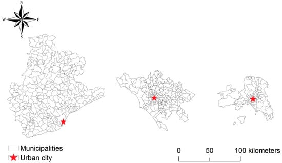 The study area included three metropolitan regions in southern Europe: Barcelona (Spain), Rome (Italy), and Athens (Greece). Considering territorial divisions based on administrative boundaries, broad regions surrounding the central city were selected as the study area with the aim to assess long-term spatial changes in population distribution, as shown in Figure 1: (i) Barcelona’s province, (ii) Rome’s province, and (iii) a large part of the administrative Attica region (including Athens, Piraeus, mainland municipalities, and Salamina island, and excluding mainland and island municipalities located in the geographical region of Peloponnese).