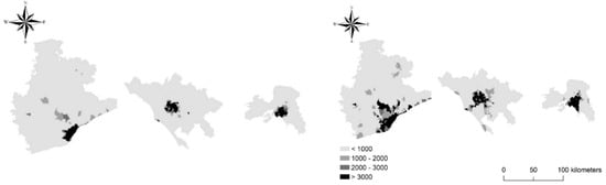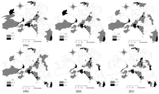 Municipalities and homogeneous economic districts were frequently adopted as the elementary analysis’ unit in a spatially-explicit analysis of urbanization, demographic transformations, and regional economic change [13,34]. Criticism was raised on their relevance for evaluation of population dynamics and coherent urban growth trajectories, municipalities, and other spatially-disaggregated administrative units [53]. However, these units allow a detailed investigation of population density over a relatively long time interval, due to homogeneous and standardized census data available for past decades [14].