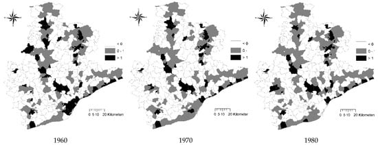 The spatial distribution of the standardized residuals from the log-linear model for Barcelona described in Table 1 is illustrated in Figure 3. Standardized residuals >1 identified (i) coastal municipalities surrounding Barcelona and (ii) inland municipalities situated along the major transport routes to central Spain (Zaragoza) and the Pyrenees mountains. The first group include towns like Matarò, Sitges, and Vilanova i la Geltrù; the second group include towns like Sabadell, Terrassa, Granollers, Sant Cugat, Martorell, Rubì, Manresa, Vic, and Berga. Some of these locations were classified as residential/employment sub-centers in earlier studies. Inland places like Manresa, Vic, and Berga were characterized as head towns of (more or less) wide rural districts functionally connected with (but physically separated from) Barcelona. Interestingly, Barcelona and the neighboring municipalities (e.g., Badalona) received highly positive residuals in 1961 only, indicating a substantial change from a more centralized model to a de-centralized structure with sub-centers consolidating at distances progressively further away from the central city.