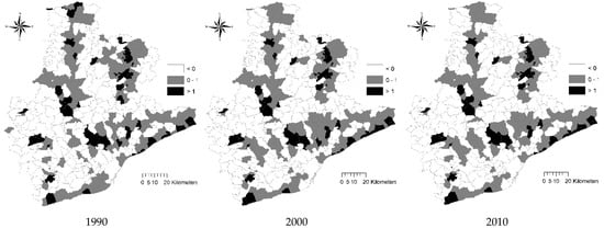 The spatial distribution of the standardized residuals of the model described in Table 1 for Athens is illustrated in Figure 5. Municipalities with standardized residuals >1 were relatively few and scattered over space compared with both Rome and Barcelona. Two groups of municipalities were detected: (i) peripheral districts belonging to the Greater Athens area and mainly situated in the Piraeus prefecture and in a district north-east of Athens experiencing rapid urban expansion since the 1980s, and (ii) coastal municipalities west, south-east, and north of Athens, at distances between 30 km and 50 km from downtown (Lavrio, Oropos, Rafina). As in Barcelona, central municipalities around Athens had negative (or slightly positive) standardized residuals. As in Rome, peripheral districts in Athens received standardized residuals progressively less positive over time.