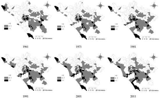 The spatial distribution of the standardized residuals from the model described in Table 1 for Rome is illustrated in Figure 4. Standardized residuals >1 were more scattered over space than in Barcelona and identify different clusters of municipalities: (i) peripheral districts belonging to Rome’s agglomeration (including the coastal town of Ostia, belonging to Rome’s municipalities but physically distinct from the main city and at a distance of more than 20 km from the city center), (ii) coastal municipalities at distances between 30 km and 50 km from Rome (including towns such as Civitavecchia and Anzio-Nettuno, with a leading role for the surrounding rural district), and (iii) internal municipalities situated in the Castelli Romani district, a traditional rural territory where some locations consolidated as local centers are attracting population and employment. As in Barcelona, peripheral districts in Rome received residuals progressively less positive over time.