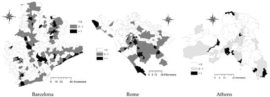 Considering municipalities with standardized residuals systematically above 1 over the study period as candidate sub-centers, as shown in Figure 6, a differentiated spatial pattern emerges for the three cities. For Barcelona, municipalities with average residuals >1 were identified along the sea coast (e.g., Matarò), the outer ring of Barcelona (Sabadell, Terrassa), and in more internal locations along the highways to Zaragoza (Manresa) and Pyrenees (Vic, Berga). Potential sub-centers in Rome were mainly located in the outer city ring (Ostia, Ciampino, and surrounding districts), along the coastal line (Civitavecchia, Ladispoli, Anzio) and in more internal locations (Frascati, Albano, Marino in Castelli Romani districts and Colleferro, along the highway to Naples). Candidate sub-centers in Athens were identified as specific municipalities in the Greater Athens area (Kifissià, Glyfada), and along the sea coast farther away from Athens (Elefsis, Lavrio, Oropos).