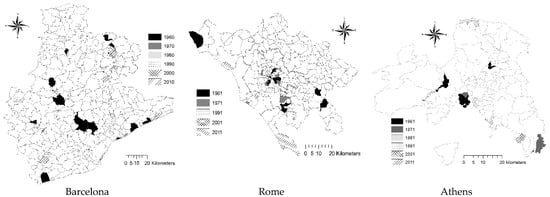 Population density was calculated from data quantifying resident population at a municipal scale and a municipal area (km2), collected on behalf of the General Census of Population carried out in each country once per decade, 1960–2010 (or 1961–2011). Data were analyzed consistently for Barcelona, Rome, and Athens with the aim to assess changes over time in the spatial distribution of population across each region, as show in Figure 2.
