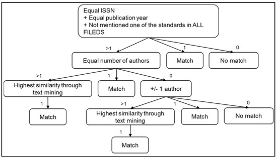 Regarding the examining of the propositions, we use scientific articles and reviews as defined units of knowledge. These units should include publications addressing standards and comparable publications, which are not addressing standards. In other words, this implies that the set of publications addressing standards (original set) is extended by a comparable set of most-related publications (matching set). Figure 1 illustrates the procedure to identify the most-related publications for each publication of the original set. An algorithm was designed which firstly, collects all articles not referring to one of the standards in the same journal and publication year. Secondly, the algorithm seeks for articles with the same number of authors to mitigate against the risk of self-citation. If no article was found with the same number of authors, the number of authors is extended by plus/minus one author. Finally, we measured the content conformity of articles through a comparison of the title, abstracts and author keywords similar to the search algorithm of the National Library of Medicine (NLM) [25,63]. The content similarity was conducted via text mining (with the weights: Article 0.5; Title: 0.3; Keywords: 0.2). There is no match if no other article in the same journal and the same publication year or no other article with plus/minus one authors exists. Likewise, there is no match if there is neither an abstract nor author keywords available for the original article.