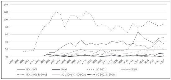 This section portrays the basic picture of the data set and offers a first glance how management standards diffuse within the academic literature. Figure 2 shows the frequency of articles between the first publication in 1988 until 2017. It is obvious that publications addressing ISO 9001 represent the majority followed by ISO 14001. This is line with expectations because the ISO standards have an international audience and much more users around the world. Although, post-millennial the number of publications addressing ISO 9001 decreases.