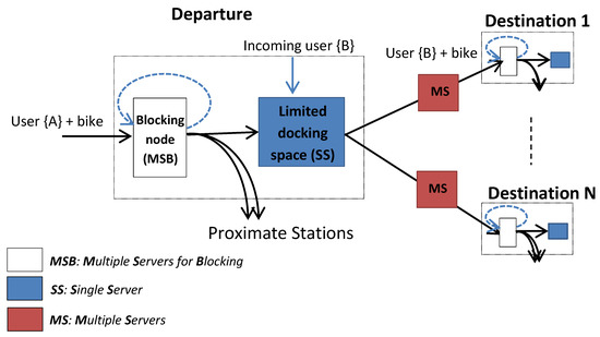 Step 2-a. If a secondary bike station < M S B j , S S j > (a neighboring station) is chosen, the bike leaves the local process associated with the bike station i.